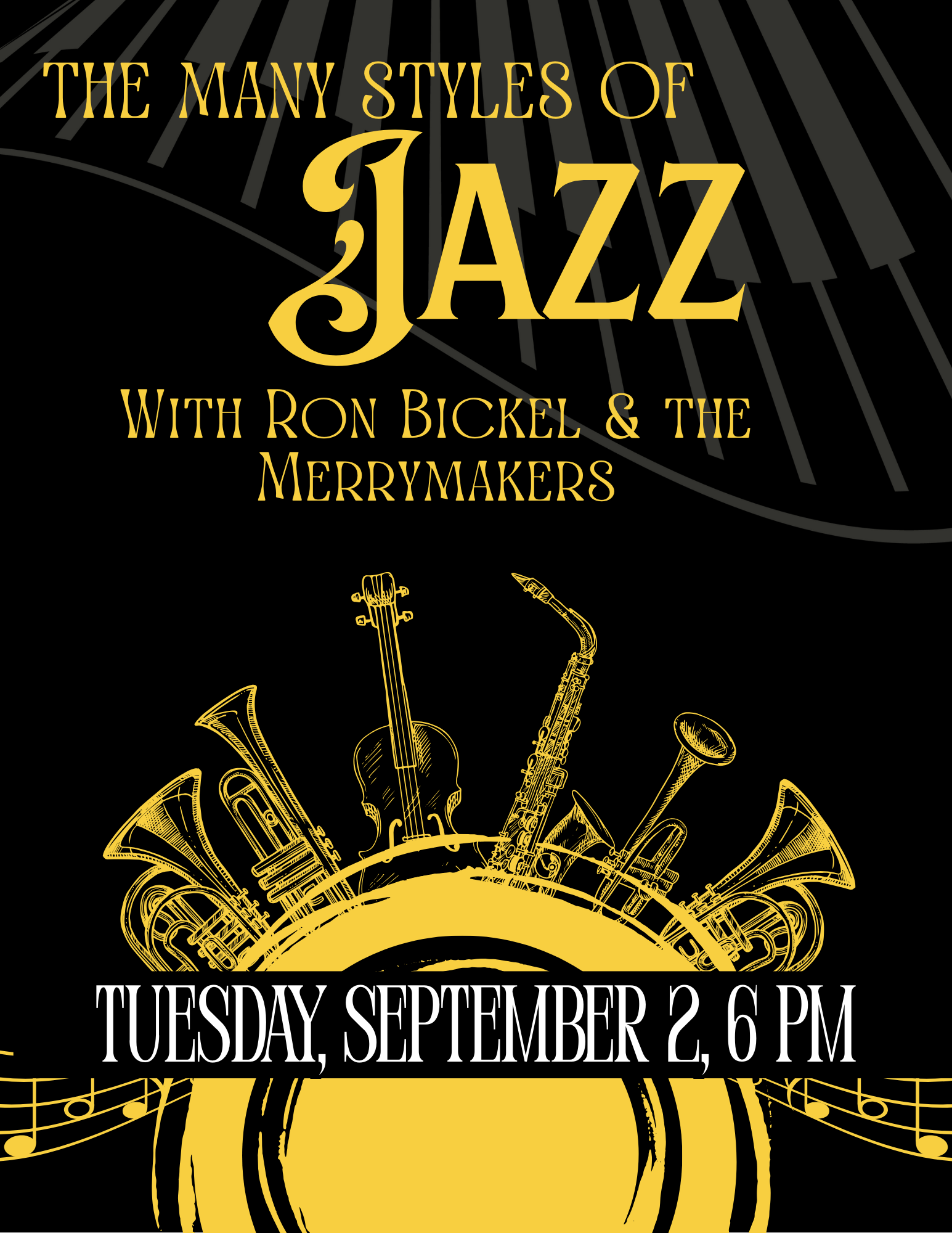 Join professional musicians Ron Bickel & the Merrymakers for a free concert and lecture on the many styles of jazz. This program explores the many styles of jazz through the playing of musical selections and explanation of the varied styles of jazz.